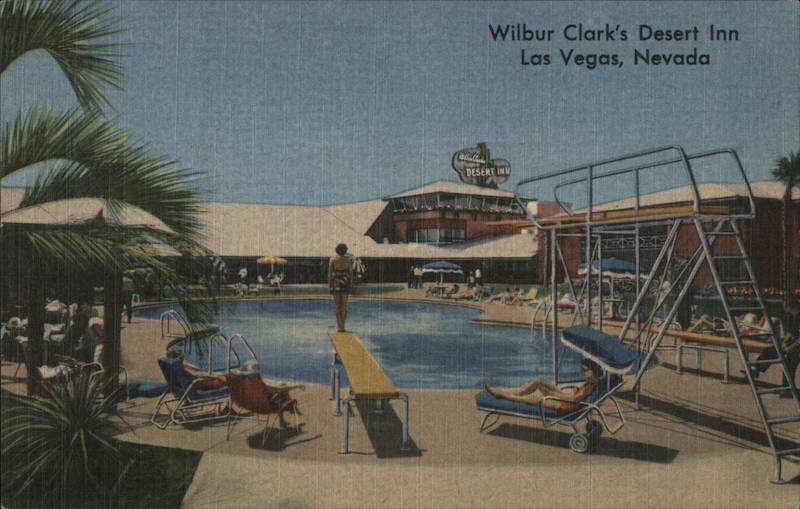| Swimming Pool Wilbur Clark's Desert Inn Las Vegas, Nevada. The beautiful figure-eight swimming pool is of Olympic size, and is the largest at a Las Vegas resort hotel. The up-to-date purification system keeps the water in the pool purer than the water you drink. It is supervised at all times by expert attendants. |