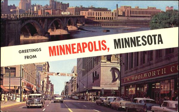 | Top: A beautiful concrete structure over the Mississippi River just below St. Anthony Falls. Prominent building on the right, across the river, is the U.S. Post office. Bottom: Known as the "Fifth Avenue of the Northwest," Nicollet Avenue is noted for its fine modern stores furnishing merchandise from all over the world. M-165. |