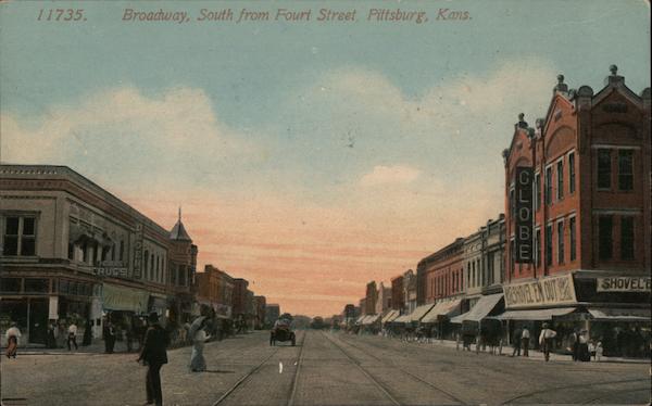 Front: 11735. Broadway, South from Fourt Street, Pittsburg, Kans. CRUGS! BETONO OLO MASHOVEL EN OUT 12 SHOVEL'E Back: CHICAS Pub. by The Acmegraph Co., Chicago, مالك STAMPHERE TWO CENTS