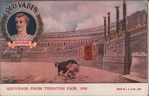 Front: QUO VADIS 5+CIGAR PASAGRACUSARS LAGLA Creepy Od paty SOUVENIR FROM TRENTON FAIR, 1908 PHO cottyts OYA PRESS OF J. A. & CO.-50M Back: THIS PORTION MAY BE USED FOR COMMUNICATION FOR THE ADDRESS STAM P HERE