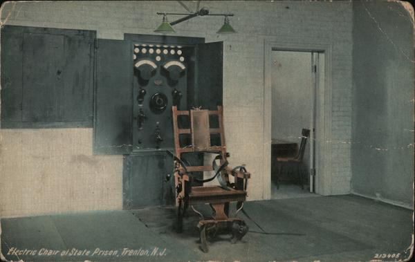 Front: Electric Chair at State Prison, Trenton, N.J. 213405 Back: The Leighton & Valentine Co., N.Y. City. THROUGHOUT TRADE MARK. &L QUALITY FAMOUS THE WORLD CARD