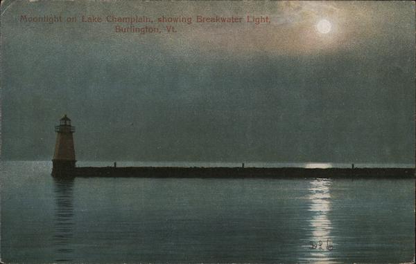 Moonlight on Lake Champlain, showing Breakwater Light,