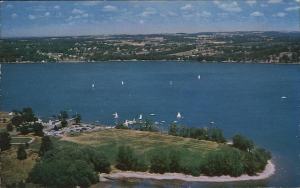 Sailing on beautiful Skaneateles Lake, N. Y. Country Club in foreground. Aerial photo by Herbert Lanks C5188 Color R Cand FROM KODACHROME A MIKE ROBERTS COLOR PRODUCTION, BERKELEY 2, CALIF. *