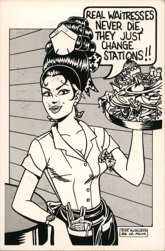 Front: REAL WAITRESSES NEVER DIE THEY JUST CHANGE STATIONS!! AM 85 AUGUSTO DE LA PAVA Back: mu FO 1017 THE AMERICAN POSTCARD COMPANY, INC ALL RIGHTS RESERVED HOT LAVA FOR THE AMERICAN POSTCARD COMPANY