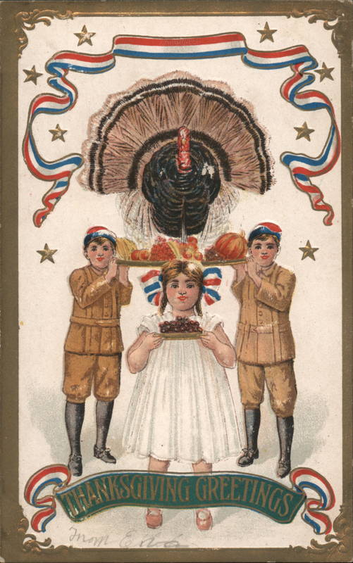 Front: 18 Mom Conta 000 HANKSGIVING GREETINGS * Back: Levelezö - Lap. Brefkort- Briefkaart.- Brevkort. evk postal, S. B. 259 Postkarte.- 14- ОТКРЫТОЕ ПИСьмо. Tarjeta postal. - Carto Dopisnice. FOR MESSAGE ONLY. from Mar Deller Smelly Paole Eva