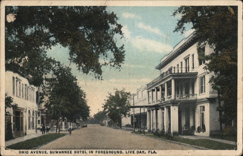 Front: IT OHIO AVENUE, SUWANNEE HOTEL IN FOREGROUND, LIVE OAK, FLA. will SZIM Back: 45084-PUB. BY ASHEVILLE POST CARD CO., ASHEVILLE, N. C. al PLACE