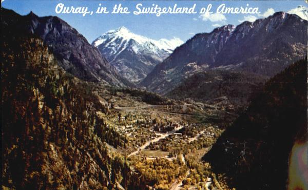 | Ouray, in the Switzerland of America. Ouray, in a high mountain bowl, 7,800 feet in elevation, is the heart of a scenic wonderland in Colorado known as "The Switzerland of America," where within 25 miles of Ouray more than fifty mountain peaks-tower 12,000 to over 14,000 feet above sea level. Truly a mountain lover's paradise. |