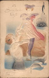 Dainty Bathing Girls with Humorous Poem, Stripe...