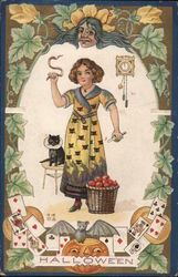 Girl giving a black cat a pipe in a Jack o' Lan...