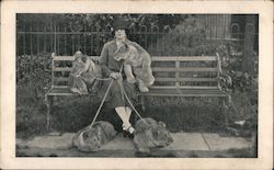 Older Woman with Four Lions on Leashes