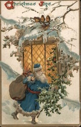 Santa Claus in Blue Suit Climbing Chimney with ...